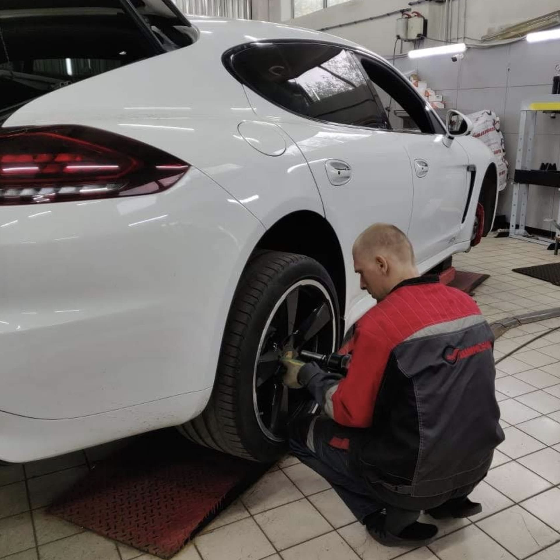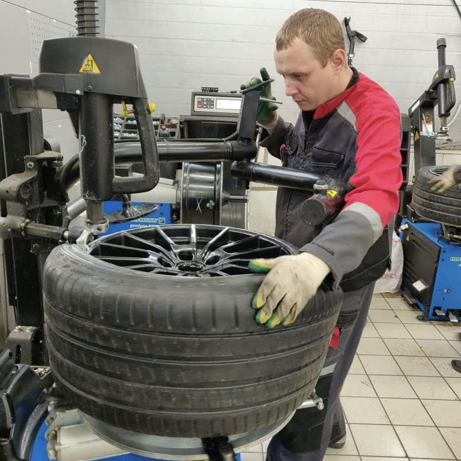 Приятно удивили работой: колеса поменяли оперативно, старые аккуратно упаковали и сложили в багажник. Видно, что мастера работают профессионально. Есть удобная зона ожидания с экраном - можно наблюдать за процессом.