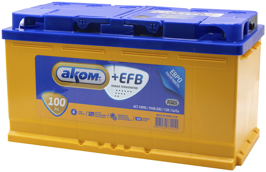 Аккумулятор AKOM +EFB — новейшая разработка завода «Аком» (г. Жигулёвск), созданная с применением технологии EFB. Благодаря усовершенствованной конструкции пластин, технологии PUNCH и улучшенному сепаратору, срок службы увеличен вдвое по сравнению с классическими аккумуляторами.