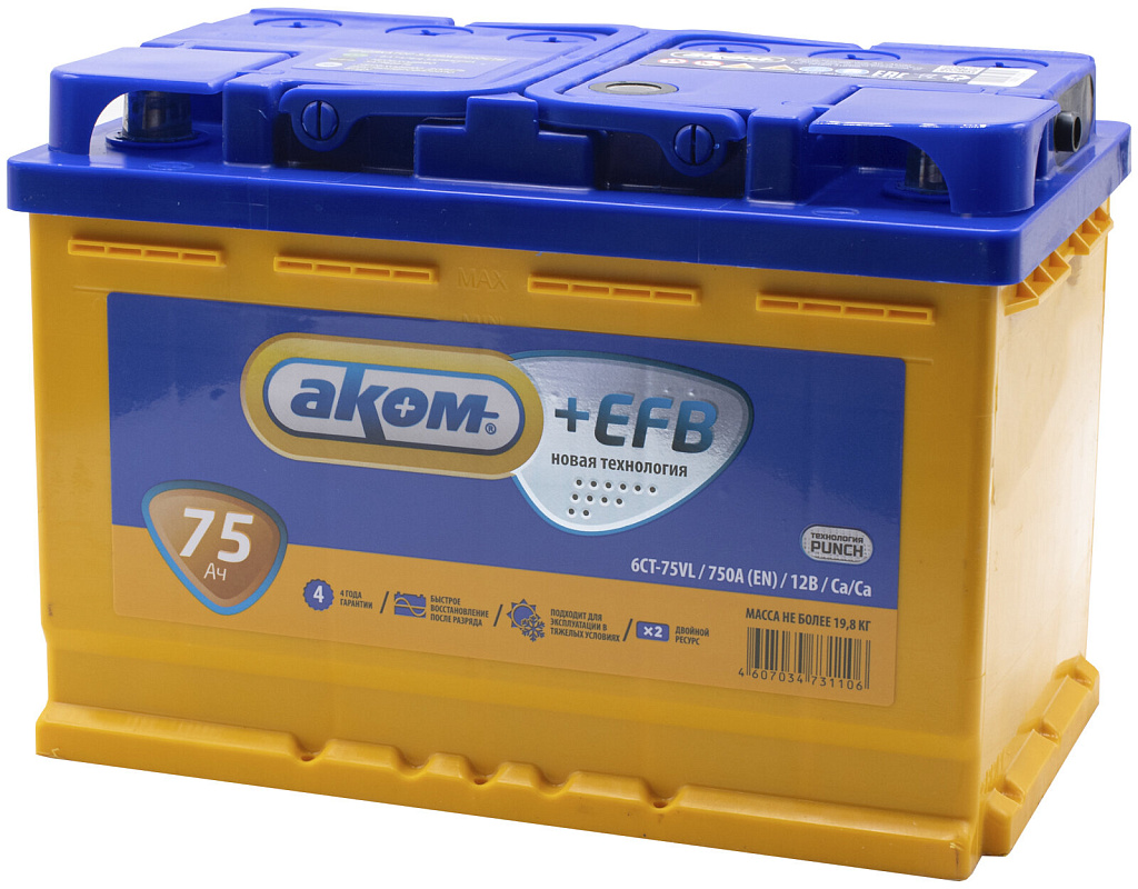 Аккумулятор AKOM +EFB 75 Ач 750 А прямая полярность