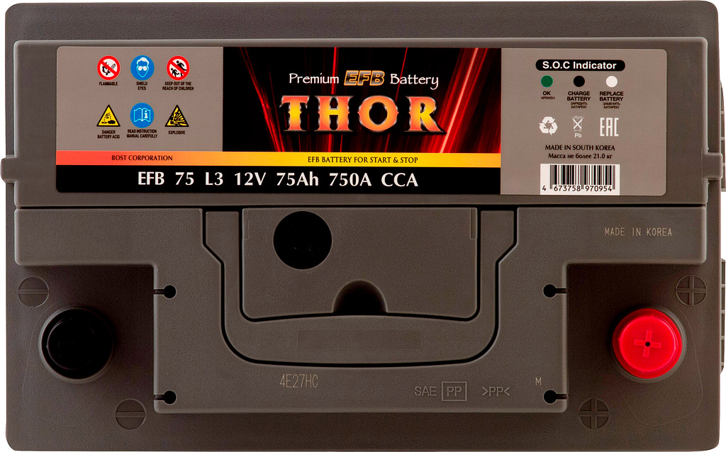 Аккумуляторы THOR EFB — это современная линейка, разработанная и произведённая компанией BOST CORPORATION (Южная Корея). Они предназначены для автомобилей, оснащённых системой Start-Stop, и отличаются повышенной устойчивостью к циклическим нагрузкам.