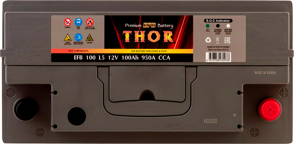 Аккумуляторы THOR EFB — это современная линейка, разработанная и произведённая компанией BOST CORPORATION (Южная Корея). Они предназначены для автомобилей, оснащённых системой Start-Stop, и отличаются повышенной устойчивостью к циклическим нагрузкам.