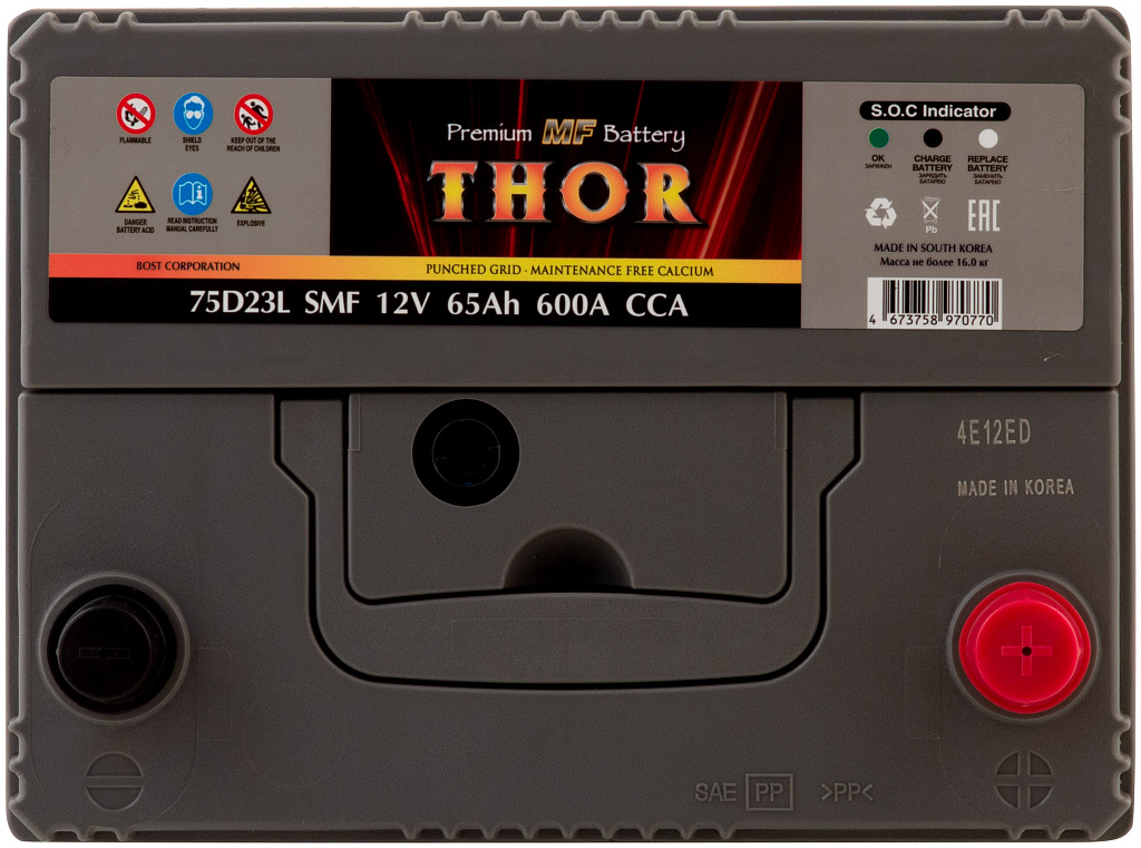 Автомобильный аккумулятор THOR SMF — серия аккумуляторов премиум-класса, выпускаемая заводом BOST CORPORATION (Южная Корея). Производитель применяет запатентованные технологии и материалы высокого качества, обеспечивая стабильную работу и продолжительный срок службы батарей.