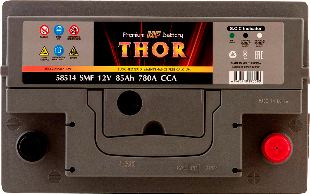 Автомобильный аккумулятор THOR SMF — серия аккумуляторов премиум-класса, выпускаемая заводом BOST CORPORATION (Южная Корея). Производитель применяет запатентованные технологии и материалы высокого качества, обеспечивая стабильную работу и продолжительный срок службы батарей.