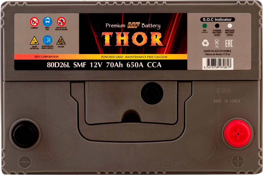 Автомобильный аккумулятор THOR SMF — серия аккумуляторов премиум-класса, выпускаемая заводом BOST CORPORATION (Южная Корея). Производитель применяет запатентованные технологии и материалы высокого качества, обеспечивая стабильную работу и продолжительный срок службы батарей.